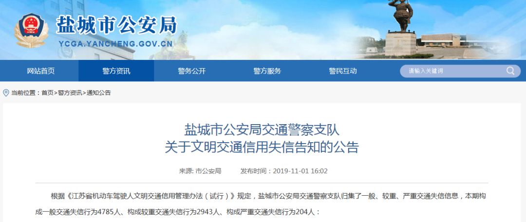 根据《江苏省机动车驾驶人文明交通信用管理办法(试行)》规定,盐城市公安局交通警察支队归集了一般、较重、严重交通失信信息,本期构成一般交通失信行为4785人、构成较重交通失信行为2943人、构成严重交通失信行为204人。