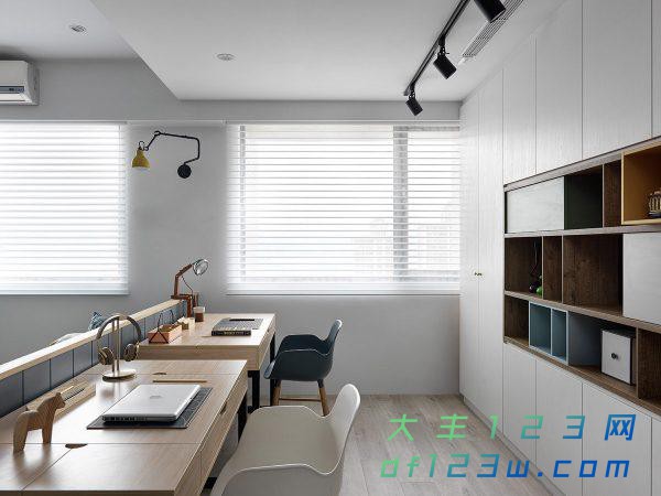 其实客厅的区域很大,但因为夫妻二人工作繁忙,难免有时候在家也需要处理公务,所以利用沙发的摆放将客厅一分为二,隔板和书桌一体,分割出一个工作学习的区域。原木色书桌、纯色高脚椅、简约的台灯、天花板的轨道灯,办公区域朴素干练十分符合白领作风。