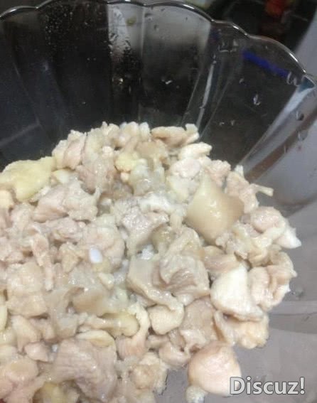 2、将杏鲍菇煮8成熟,切成条、鸡肉洗干净切成丁、姜蒜准备好