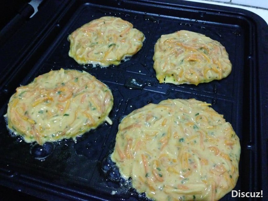 6. 预热好的电饼铛,倒入少量的食用油,把鸡蛋糊糊摊入铁板上,两面煎成金黄即可。(我选用了下盖中火加热,功能菜单选用的“葱油饼”模式)