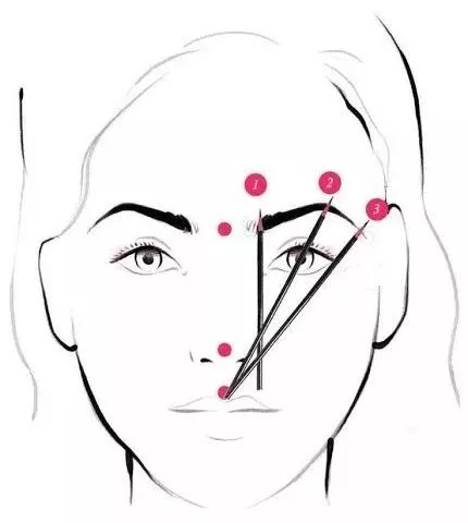 画眉之前我们需要先来get一下画眉时最基本的眉头、眉峰、眉尾的位置怎么找: 由鼻翼、眼头的连接线线向上延伸是眉头; 由鼻翼、眼球中央的连接线延伸与眉毛的交接点是眉峰; 由鼻翼、眼尾的连接线延伸与眉毛的交接处是眉尾。  画眉定点