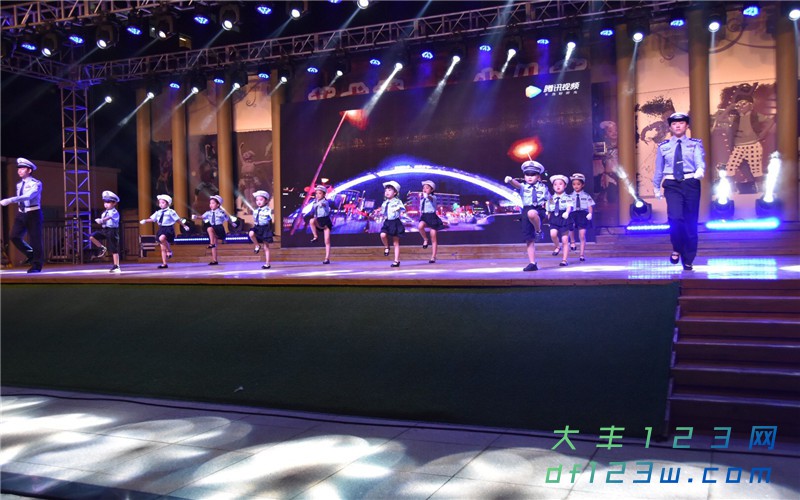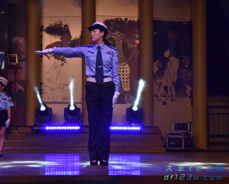 随着《人民警察之歌》的伴奏声,交警叔叔阿姨联合明达幼儿园的小朋友,一起表演《交通指挥手势操》节目。“小小交通警察”做着标准的交通指挥手势,在场上展现出交警英姿飒爽的气质。