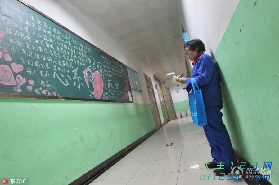 63岁的杜秀亭身着蓝色工作服、戴着老花镜,在学校走廊抄写黑板报上的内容。 (来自:腾讯教育)近日,河南郑州爱中学校一名63岁保洁工,在老师们的朋友圈里火了起来。她不是学生,却被校长称为“最美高中生”。爱中学校教务主任张怡博介绍,杜阿姨常在打扫完楼道里的卫生后,站在班级门口旁听课程,我们经常能见到,老师们也都默许。而学生们称,阿姨身上也散发着很多光亮,让他们很受感动。(东方IC供图,谢绝转载) (来自:腾讯教育)“人生何处不奋进?我们学校的保洁阿姨都这么认真,自己还有什么理由不努力。”“阿姨说很喜欢在这里干活,最喜欢的是打扫楼道的间隙,在班级门口旁听。”郑州爱中的多位老师转发图片并评论称。