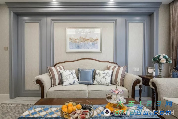 来看沙发墙,两边对称设计,丝毫看不出异常之处,中间一副挂画装饰,简洁又漂亮。布艺沙发搭配色彩、图案丰富的抱枕,舒适性极强,茶几上的水果也颇有生活气息。