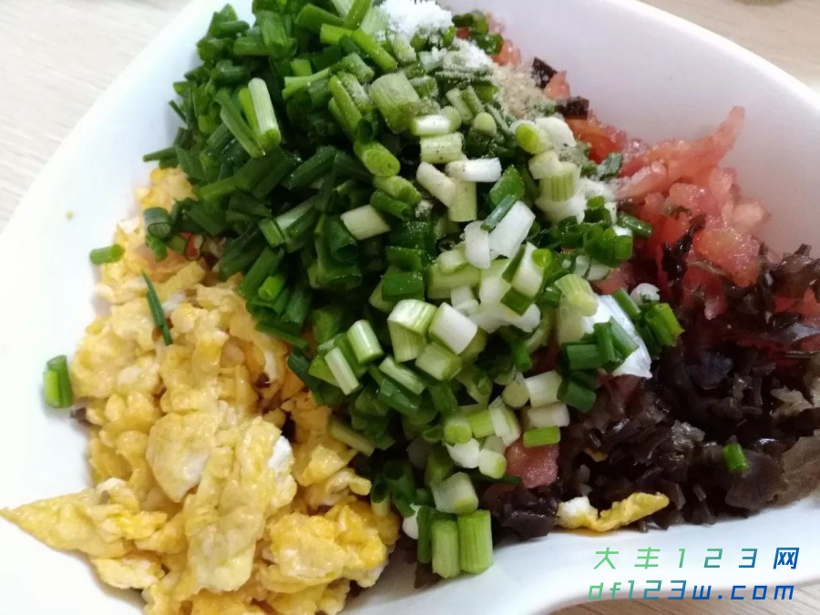 6、鸡蛋单独炒好搅碎,加入葱花、西红柿、黑木耳