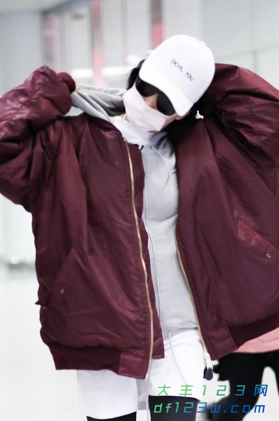 简洁的白色长款打底衫外搭灰色的连帽休闲卫衣外搭酒红色的宽松休闲拉链飞行员夹克,头戴白色字母印花鸭舌帽,酷劲十足。