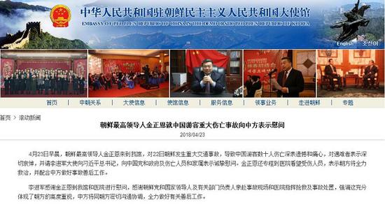 人民网北京4月24日电 (姚丽娟) 据中国驻朝鲜大使馆网站发布的消息,4月23日上午,朝鲜最高领导人金正恩来到中国驻朝鲜大使馆,对22日朝鲜发生重大交通事故,导致中国游客数十人伤亡深表遗憾和痛心。金正恩对遇难者表示深切哀悼,并请中国驻朝鲜大使李进军向习近平总书记,向中国党和政府及伤亡人员和家属表示诚挚慰问。金正恩还专程到医院看望受伤人员,表示朝方将全力救治,并配合中方做好事故善后工作。 李进军感谢金正恩到中国驻朝鲜大使馆和医院进行慰问,感谢朝鲜党和国家领导人及有关部门负责人亲赴事故现场和医院指挥抢救及事故处置,强调这充分体现了朝方的高度重视,中方将同朝方密切沟通协调,全力做好有关善后工作。 朝中社24日也报道了金正恩前一日前往中国驻朝鲜大使馆表示深切慰问的消息。该报道说,23日,金正恩还前往医院亲自了解了伤员治疗情况,并看望伤员。他还同政府医院的医务工作者一起讨论今后的治疗方案。