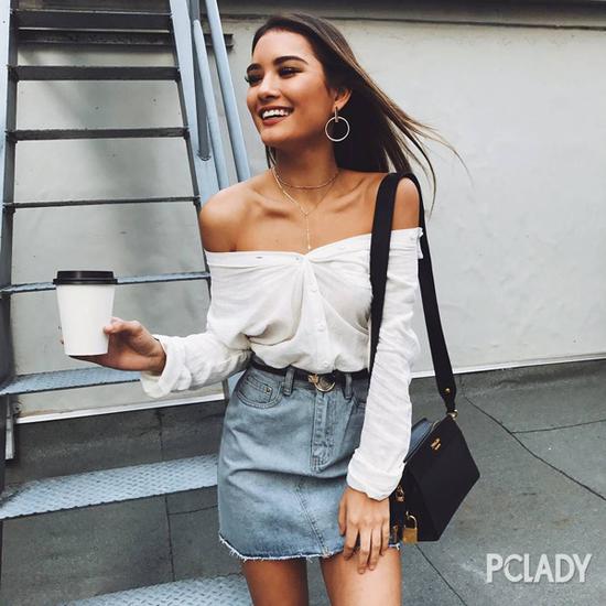 也可以直接将肩线拉到手臂的位置二次设计成一字肩的款式,也不失为白衬衫的创意穿搭效果。
