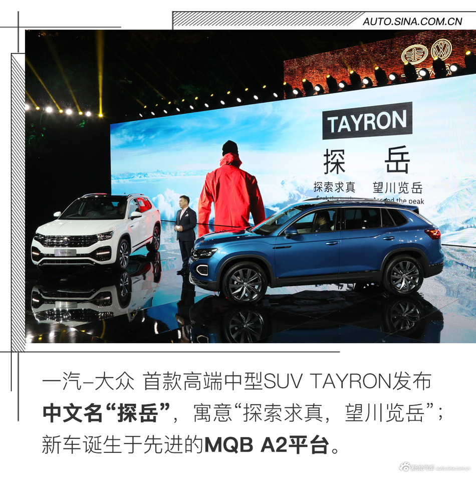 北京时间9月19日晚,一汽-大众全新中型SUV TAYRON正式发布,并定名为探岳,寓意“探索求真,望川览岳”。新车基于大众全新的MQB A2平台打造,源于欧版的途观,也是中国大陆地区途观L的姊妹车型,新车将于今年10月22日正式上市销售。 |配置|图库| 视频|口碑| 经销商
