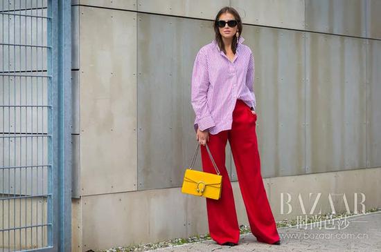 黄色由于本身也是抢眼的色彩,与罂粟红搭配的时候要降低它的面积占比,以包、鞋等配饰出场就精彩十足了,大胆的时髦更有趣哦。