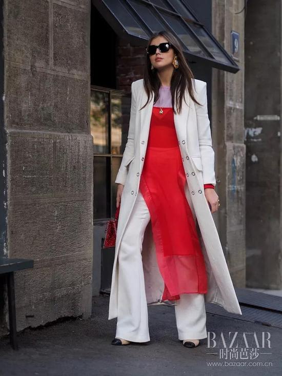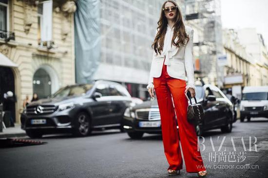 对于色彩明艳的罂粟红来说,白色的作用则是令它更低调。白色上装搭配罂粟红下装,色彩干净又无敌显白,时髦自然信手拈来。