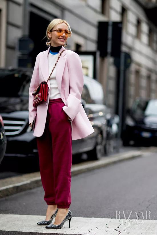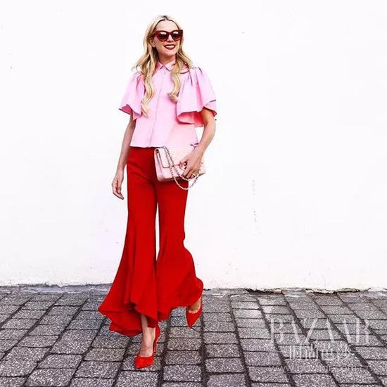 ▼ 搭粉色 ▼ 红色与粉色同属于红色系,搭配起来十分舒服。可以选择这样亮眼的枚粉色来搭配红梨色、罂粟红,造型时髦又有气场。