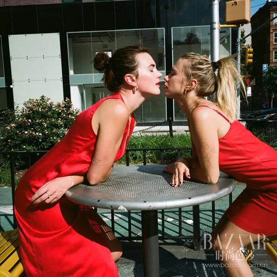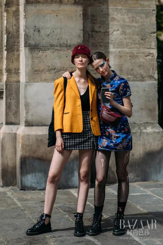 Elsa Hosk 时髦的腰包加上流行的红梨色,搭配蓝色旗袍;黄色的外套搭配一顶红梨色的渔夫帽,这对姐妹上街装扮极为大胆,但都恰到好处,有趣极了。