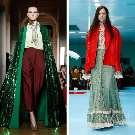 Valentino 2018秋冬高定秀场、Gucci 2018秋冬秀场 用50%的浅橄榄绿来搭配罂粟红,时髦得相当大胆,精彩十足。