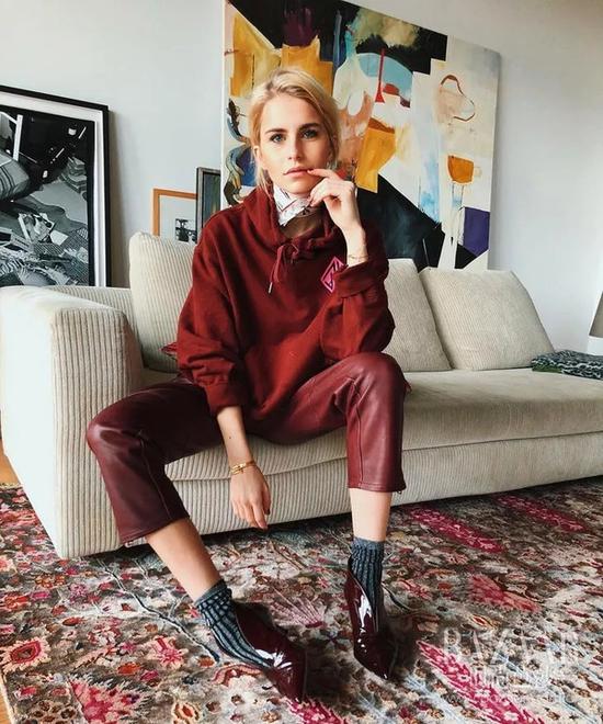 低调奢华的红梨色哑光皮质下装,与休闲的红梨色纯棉连帽卫衣相遇,一刚一柔的材质恰到好处地令造型变得时髦。