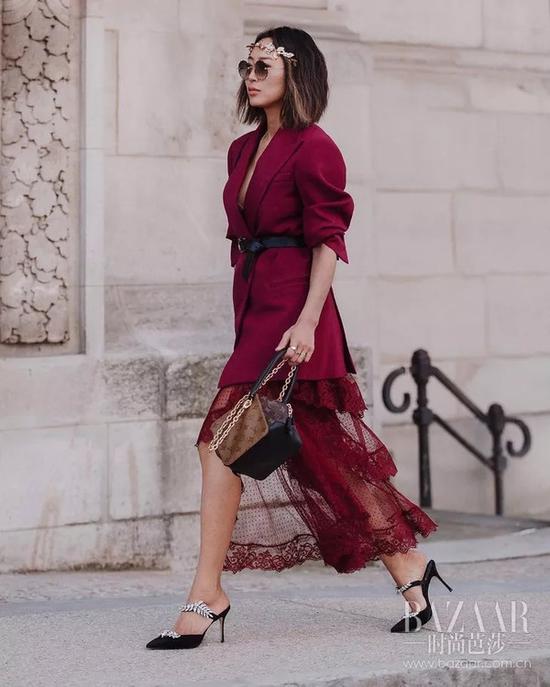 一条柔软的红梨色蕾丝长裙,打破了红梨色的沉稳,搭配硬朗的红梨色廓形西装,材质互相碰撞,刚柔相济。