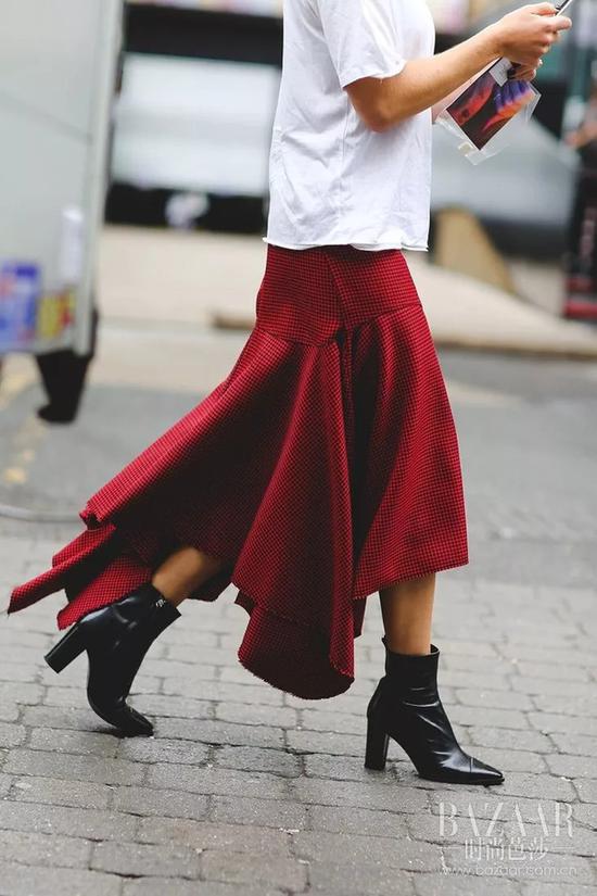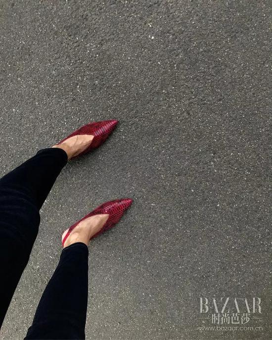 TIP3。 红梨色、罂粟红只出现10% 如果觉得50%的红梨色、罂粟红上街还是太过显眼,那不妨把这两种红色面积缩小至10%,成为包鞋等配饰,作一个点缀造型的亮色。简单的白T黑裤,搭配一双红梨色尖头鞋,有亮点又时髦。