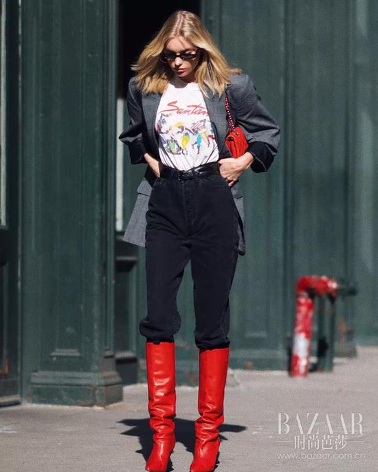 Elsa Hosk的西装白T造型,加入罂粟红的包和中筒靴后时髦指数直线上涨。