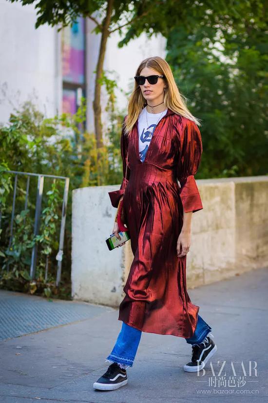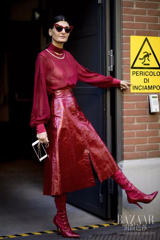 为了令红梨色更好地上身,各大品牌不约而同地推出了各种材质的红梨色单品,有皮质、丝缎、亮片……为这浓郁的色彩带来光泽,变得更具都市感。材质上的丰富选择,也造型搭配产生更多可能性,下面就来看看它们如何被搭配上街。