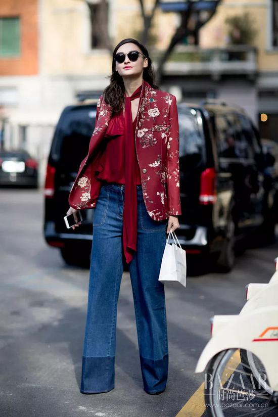 Sies Marjan、Jacquemus 2018秋冬秀场 气质的红梨色上衣优雅极致,搭配复古蓝牛仔裤相当适合,恰到好处地提亮造型,又不失大方从容的气质。