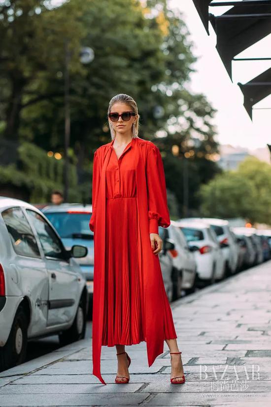 如果你的搭配功力没有这么深厚,相较于红梨色,罂粟红会更加地适合你。由于它本身就足够明亮提气,只要简单地穿上罂粟红连衣裙上街就足够吸睛。