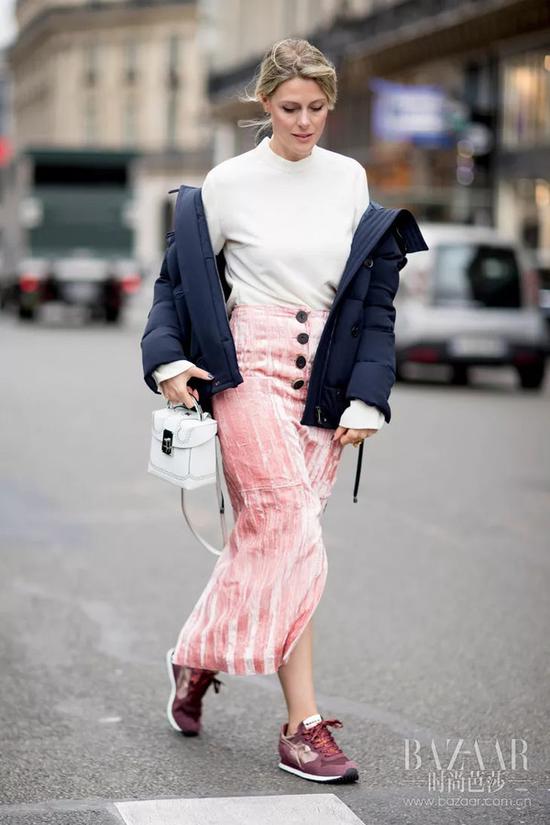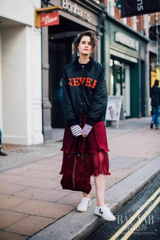 还有一种方法让你不用认真搭配,却能 get 红梨色、罂粟红与粉的少女时髦感,那就是——买一件红梨色、罂粟红与粉拼接的单品,再进行简单地搭配就能不费劲地赢很大。