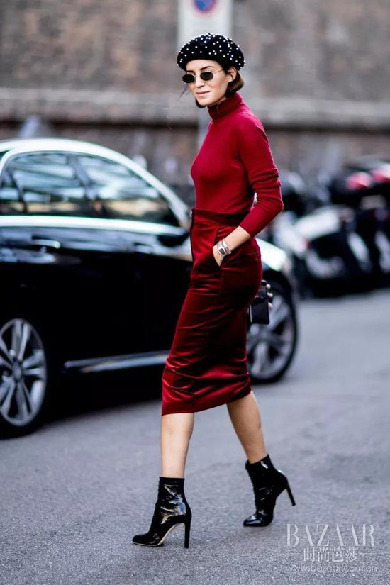 TIP.1 利用黑白色平衡 全身红梨色、罂粟红上街对你来说可能太过晃眼,这时候只要将红色面积缩小至50%,再搭配上“万金油”——黑白色,时髦不减,同时更符合日常通勤的低调需求。