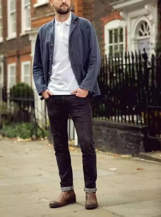 上文也提到过,大廓形的POLO能够减少其正式感,但并非唯一选择。合身版型的POLO也能够穿搭出休闲的效果。如下图,合身是指POLO的腰身没有收窄,衣长刚盖过皮带能够修饰比例。