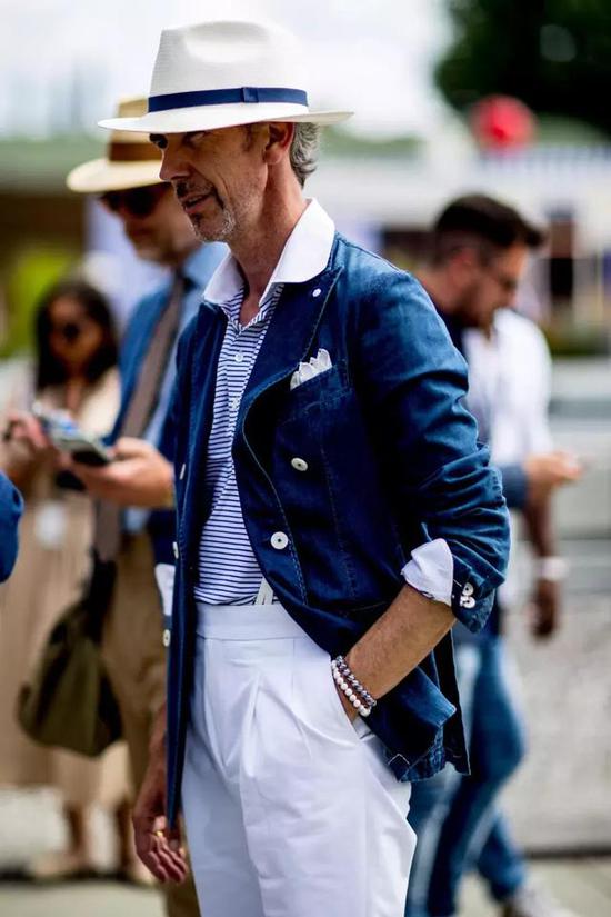 大胆的你接着还可以选择局部粗条纹的撞色款式,其实局部条纹没有想象中难驾驭,尝试像下图的搭配方法,用偏向休闲风格的夹克外套减少POLO衫的正式感,从而达到一个协调的效果。