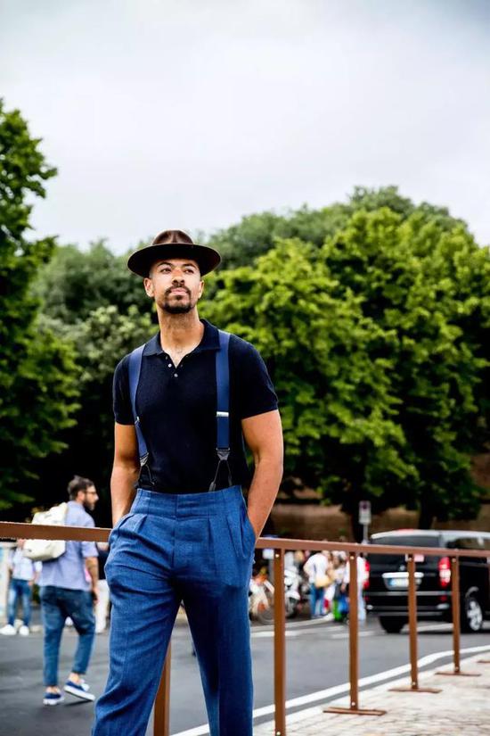 在颜色上除了经典的白色和黑色,还可以尝试饱和度较高的颜色,像下图中所穿的蓝色POLO,虽然在这个造型中还是偏向复古运动风,尤其是模特所选择的遮阳帽。但POLO的大廓形和下身宽松的裤子减少了传统POLO固有的专业感。  ▲ via FENDI