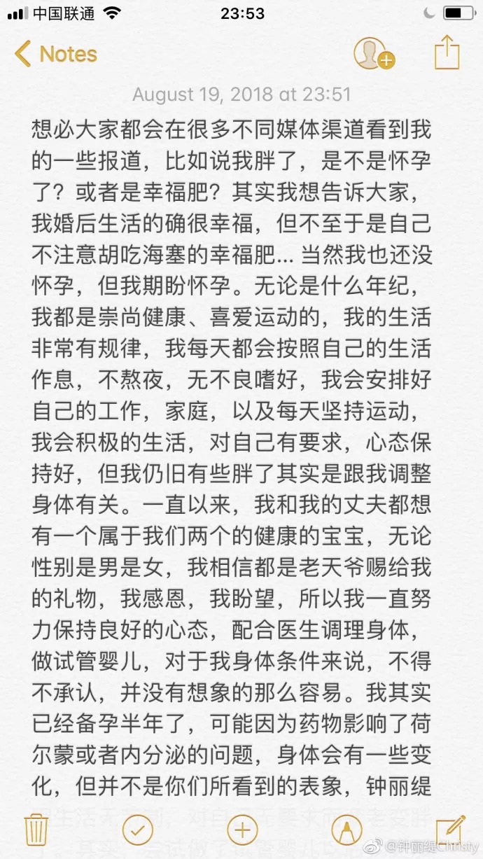 因此,汪小菲对大S有多宠,有多好,各位网友都不用太惊讶。毕竟大S为了汪家,是豁出一切包括性命的。正所谓,甘愿为男人生孩子的女人,被宠上天都不为过。 有了你,才是完整的一个家 一代女神钟丽缇今年已经48岁了,对于一个普通的48岁的女星来说,都会遭到各种非议,比如脸垮、装嫩、没作品等等。 更何况这位这么酷,敢生3个女儿,敢嫁小12岁的老公,敢在微博上说自己仍然想怀孕的钟丽缇呢。 或许是出于天性,大多数女人都会期待一个孩子降临。而女人需要付出的代价就是势必会发生的身材变形。 而高龄的女明星们为了怀孕,就必须吃药、打针,身材的变形会比一般人更触目惊心。但大众却爱用她的身材开玩笑,说她胖到老公迟早要抛弃她。 或许是大众还未能接受,女人怀孕肯定会发胖这件这么简单的事情。甚至于,当事人自己必须在网上回应,对,为了怀孕,我是胖了。 另外一位著名的大龄生产女星就是伊能静,她把自己的求子经验写在了微博中,并长时间置顶。 看过的网友都说自己的眼泪险些掉下来。 她求遍名医,从做手术调整子宫粘粘问题,到尝试试管婴儿,导致全身浮肿,脸部不忍直视,肿成猪头,数次取卵到看中医针灸,甚至一段要放弃,和老公秦勇谈分手。 最后却在停止试管婴儿2个月之后,突然自然受孕。