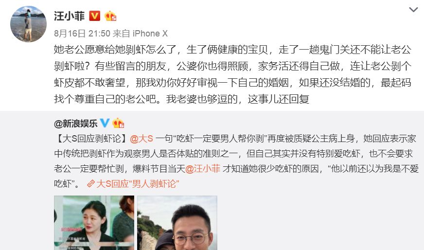 后来,大S剥虾论上热搜被怼。汪小菲更是100%护妻。