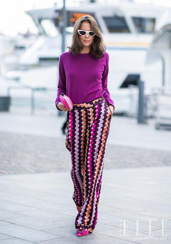 将亮眼的彩色针织用于顺色搭配其实是好穿的,因为你不用担心颜色上的冲突是否会太突兀,稍作深浅变化就可以。