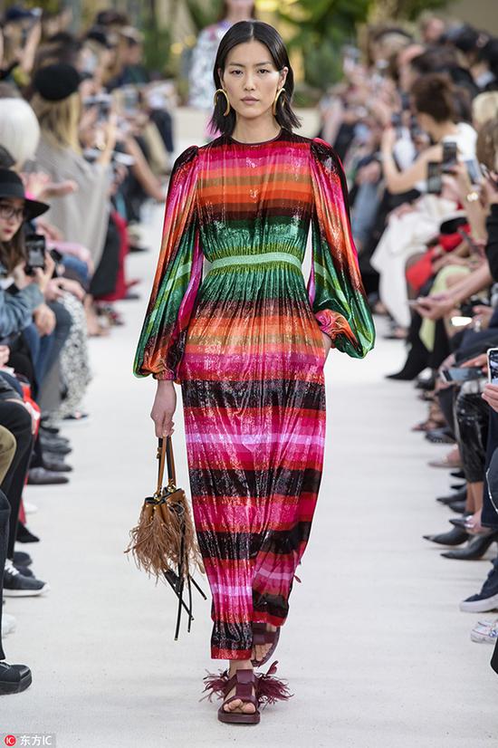 在巴黎为Valentino和Paco Rabanne上演的裙装造型更是精彩纷呈,Valentino的彩虹裙复古而夺目。Paco Rabanne的金属花纹裙更是满满的民族风情。  Valentino