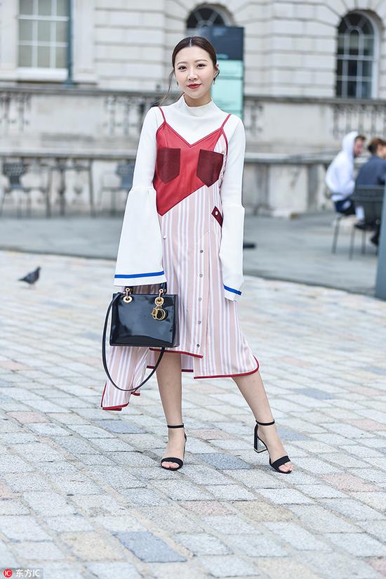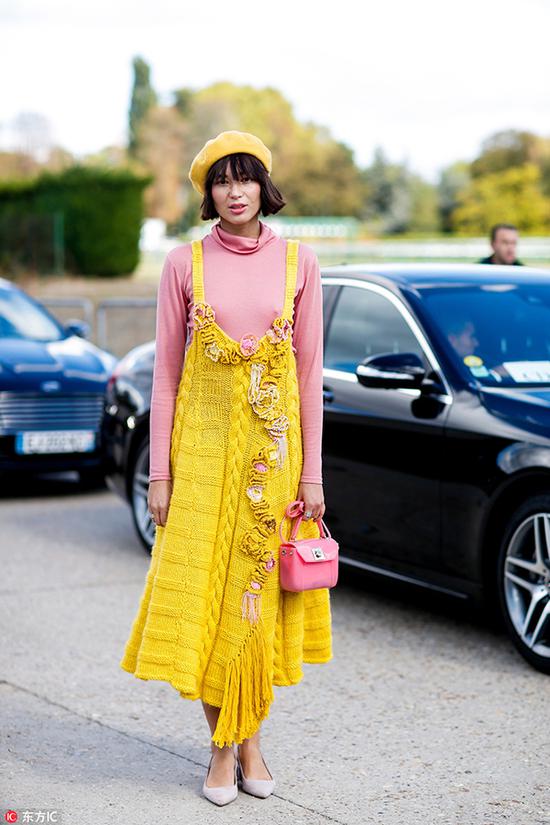 4、色块拼接 想要让神似秋衣的高领衫穿出时髦味道,你绝对不能错过色块拼接!将色块拼接的衬衫,连身裤或者吊带裙等单品,内搭高领衫,既能让这些单品在秋冬继续发光发热,高领衫带有的优雅味道还能继续让拼接单品更有质感!