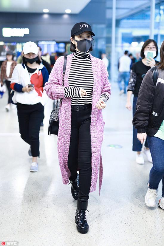 宋茜用经典的条纹高领“秋衣”搭配粉色针织开衫,长短有致层次感满分,同色系的牛仔裤和系带靴显腿长。