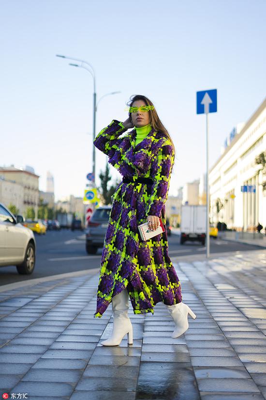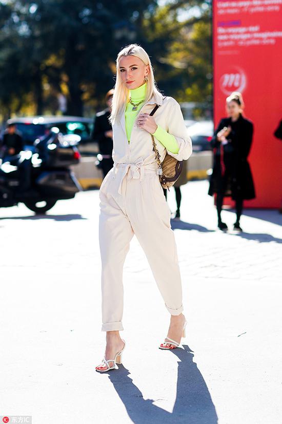 搭配的单品也尽量和荧光色高领衫保持同色调,或者用百搭的裸色或者黑灰色系来制衡荧光色的张扬。