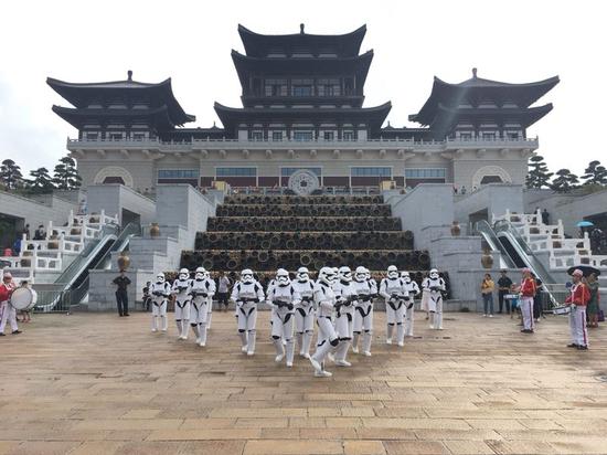 让我应接不暇的是眼前突然出现一大队身着白甲的机器人队伍,足足有二三十之多,之前还是一千多年以前,瞬间我感觉时空扭转,好像到了未来世界,在这个古镇里,感受着时空的交替,这是多么的美妙,机器人的动作都比较机械化,我想,里面的演出人员穿着这么厚的白甲,还要边行走、边表演,为的就是给游客们带来欢乐,为古镇融入了一道别样的风景。